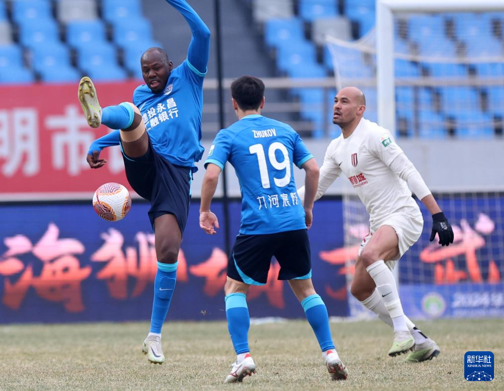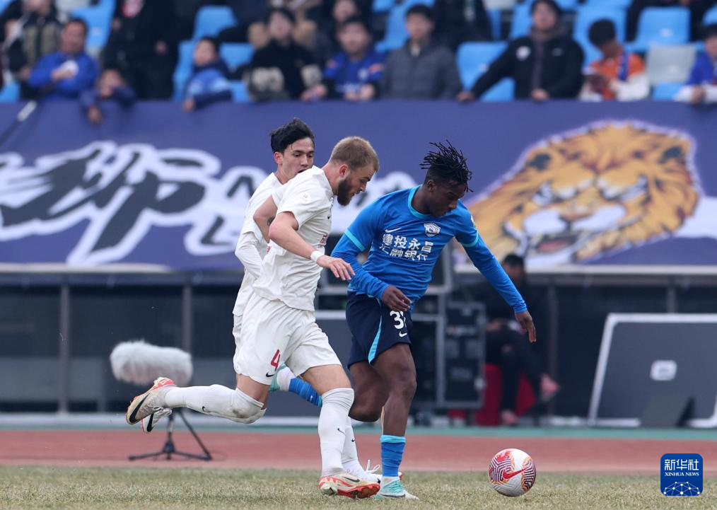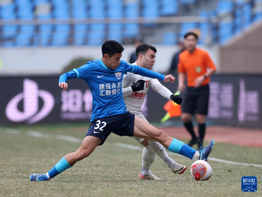 3月10日,沧州雄狮队球员孙铭谦(左)和成都蓉城队球员安德里戈拼抢。新华社发(周洋摄)