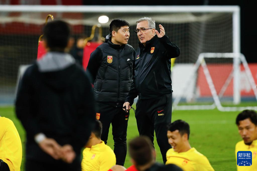 3月11日,中国男足队员和教练员在训练中。新华社发(吴志钊摄)