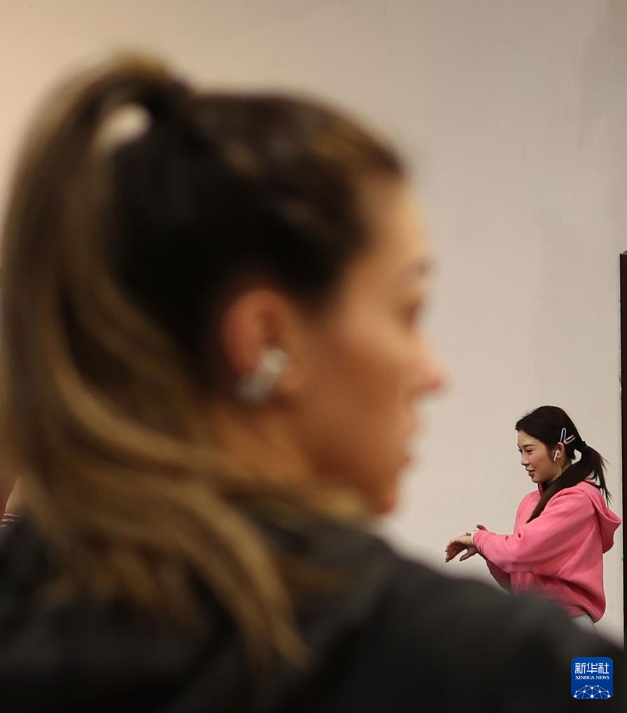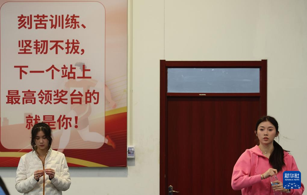 3月13日,湖南队选手夏思凝(右)与四川队选手吴艳妮在女子60米栏预赛前热身。最终,吴艳妮和夏思凝分别以8秒19、8秒35的成绩晋级决赛。新华社记者 廖宇杰 摄