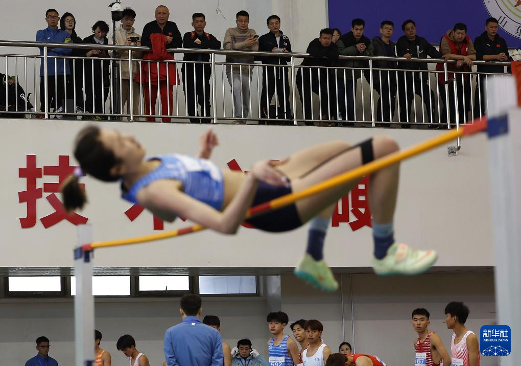 3月12日,新疆选手迪娜·奴尔兰在女子跳高决赛中试跳。她以1米84的成绩获得冠军。新华社记者 廖宇杰 摄