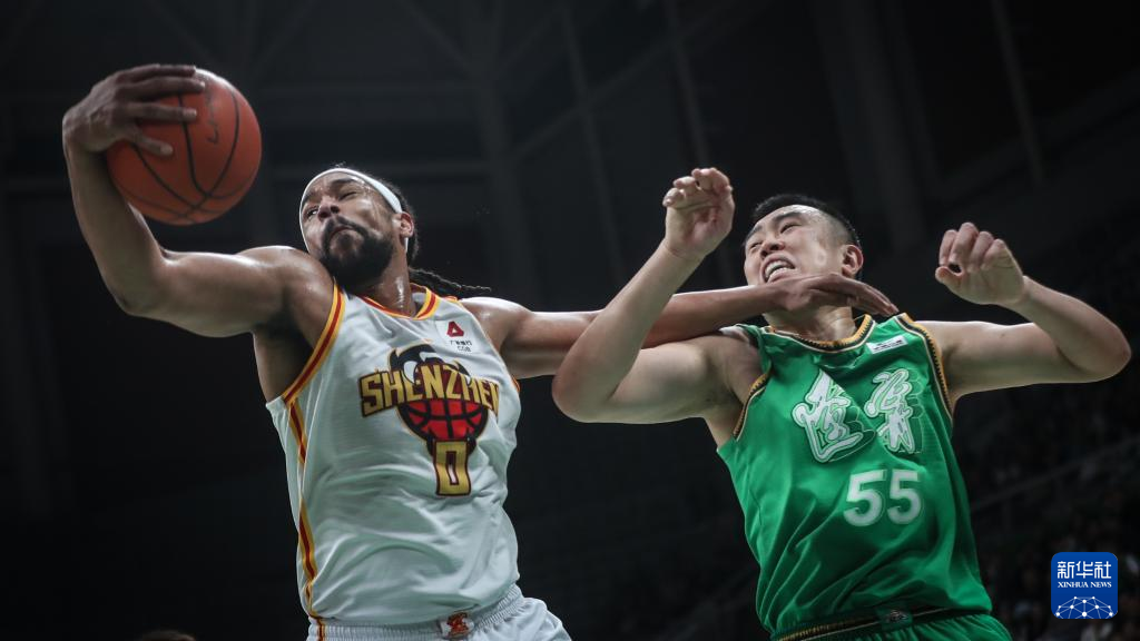 3月12日,深圳马可波罗队球员萨林杰(左)在比赛中拼抢篮板球。新华社记者 潘昱龙 摄