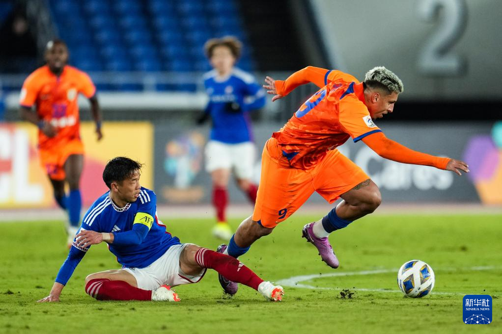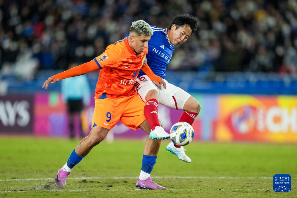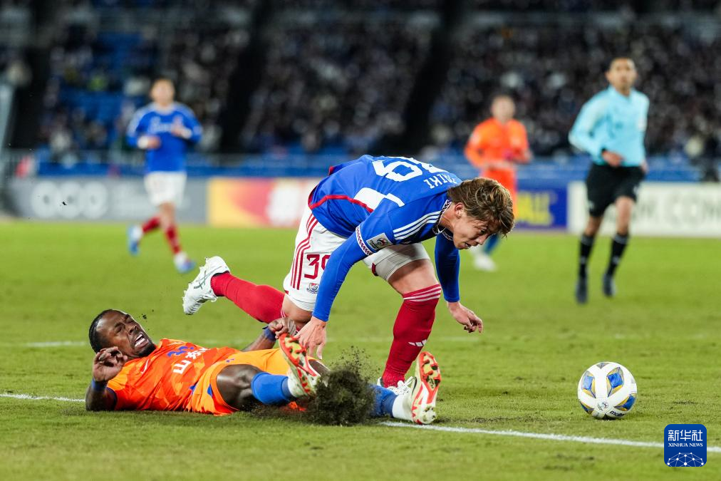 3月13日,横滨水手队球员渡边泰基(上)与山东泰山队球员费南多在比赛中拼抢。新华社记者 张笑宇 摄