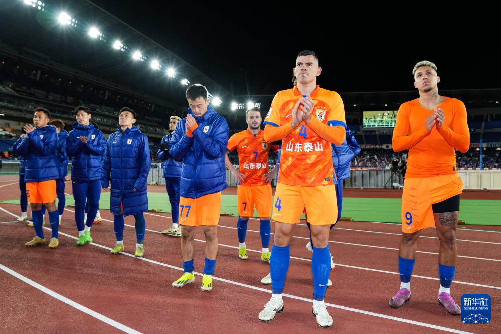 3月13日,山东泰山队球员在赛后感谢球迷。新华社记者 张笑宇 摄