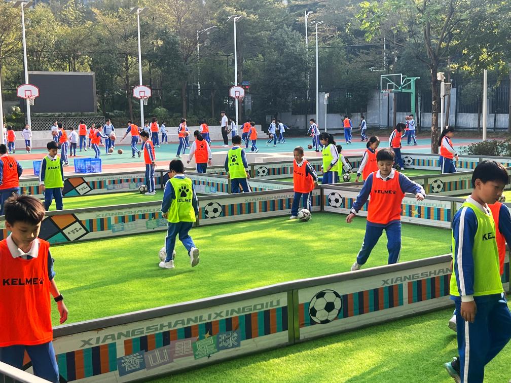 深圳市南山外国语学校香山里小学正进行一堂足球课,一个足球场被挡板分割为6块迷你场地,一个班的学生被分成6个小组,每名学生都能进行有球对抗训练。而旁边的篮球场,一个场地装了8个篮球架,学生可以分成四组进行训练。