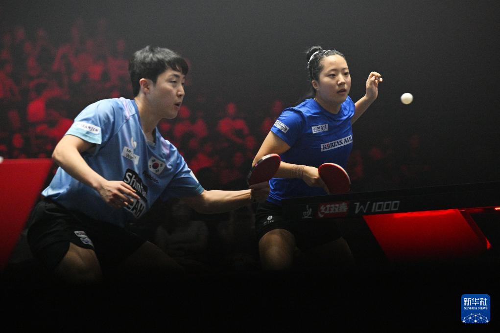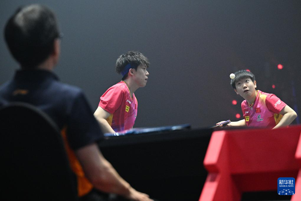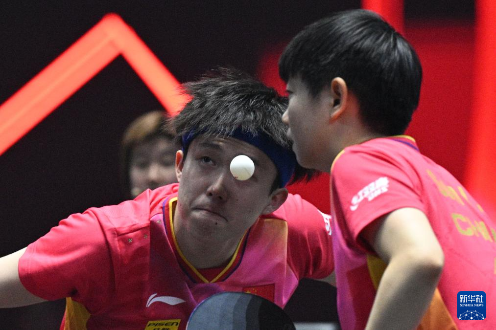3月15日,中国组合孙颖莎/王楚钦(左)在比赛中。新华社发(邓智炜摄)