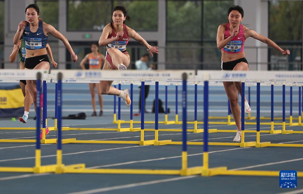 3月17日,湖南队选手夏思凝(中)在女子60米栏预赛中。她以8秒31的成绩晋级决赛。新华社记者 廖宇杰 摄