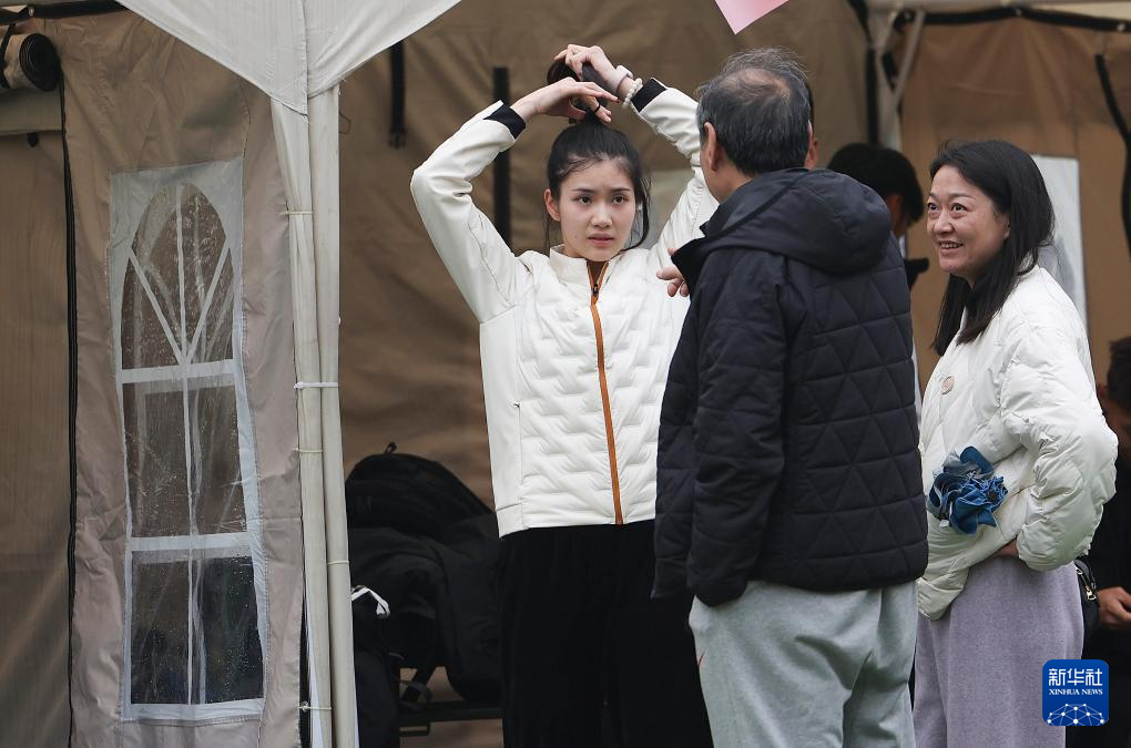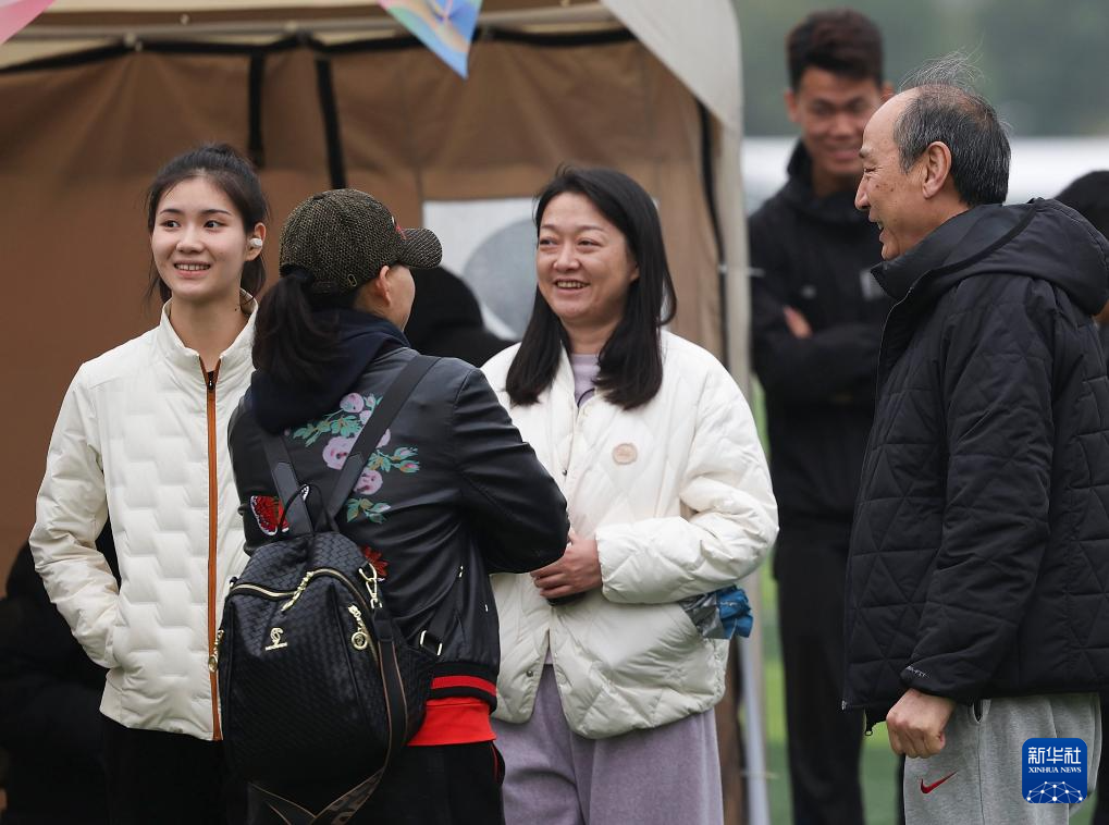 3月17日,湖南队选手夏思凝(左)和田径教练员孙海平(左二)在热身场地交流。夏思凝以8秒31的成绩晋级女子60米栏决赛。新华社记者 廖宇杰 摄
