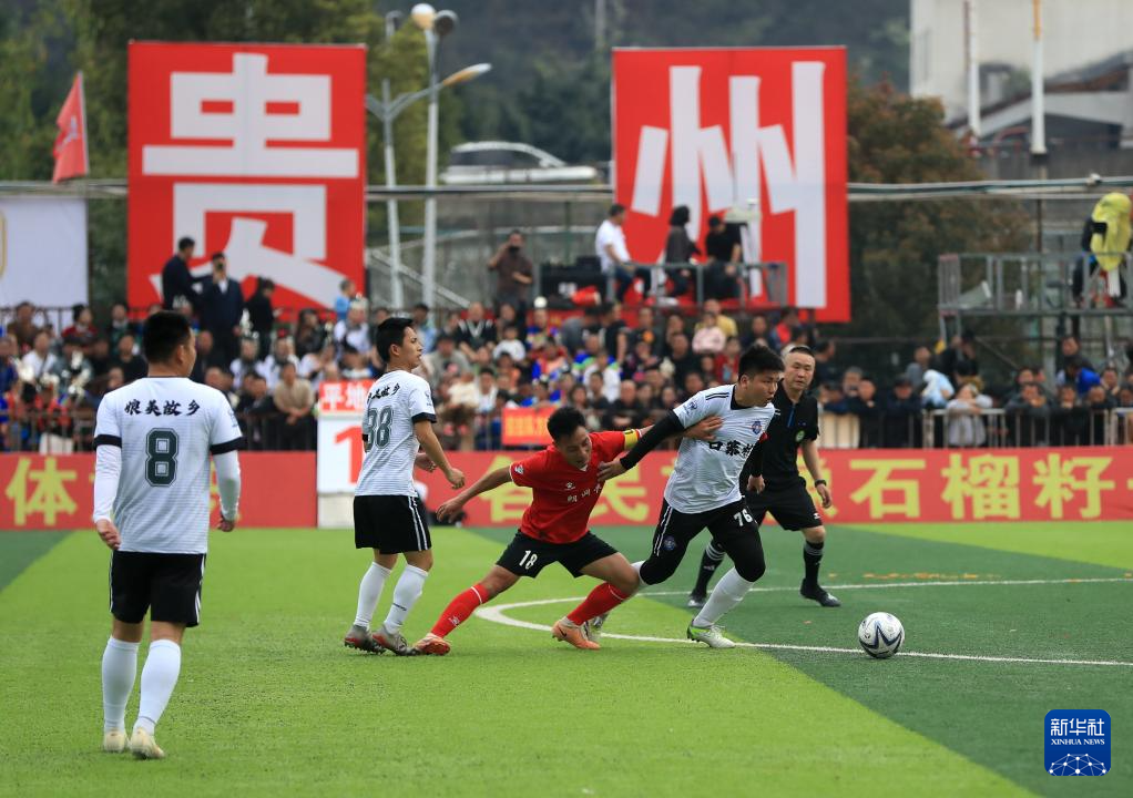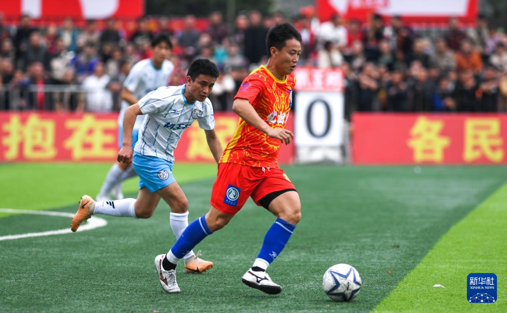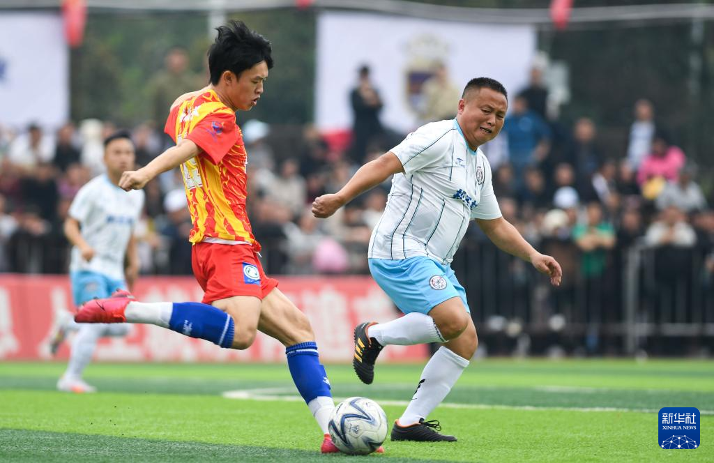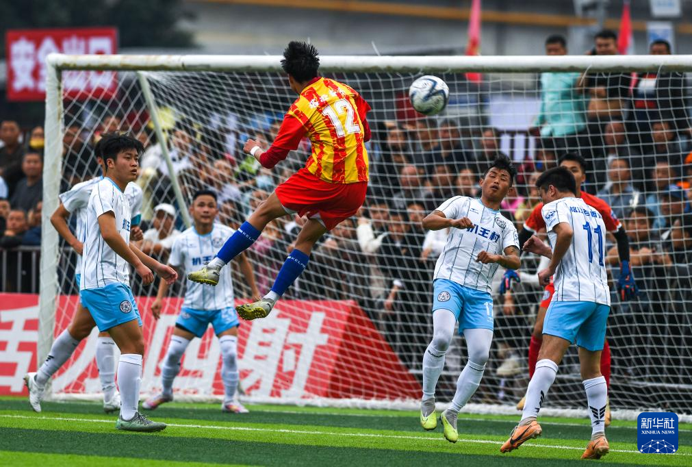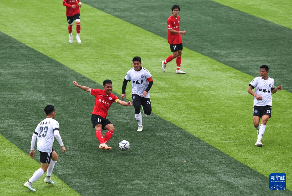 3月16日,平地村足球队球员(红衣)与口寨村足球队球员(白衣)在比赛中拼抢。新华社发(杨文舒摄)