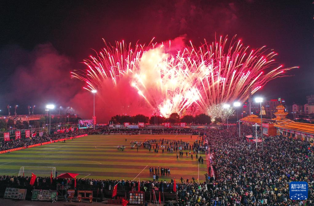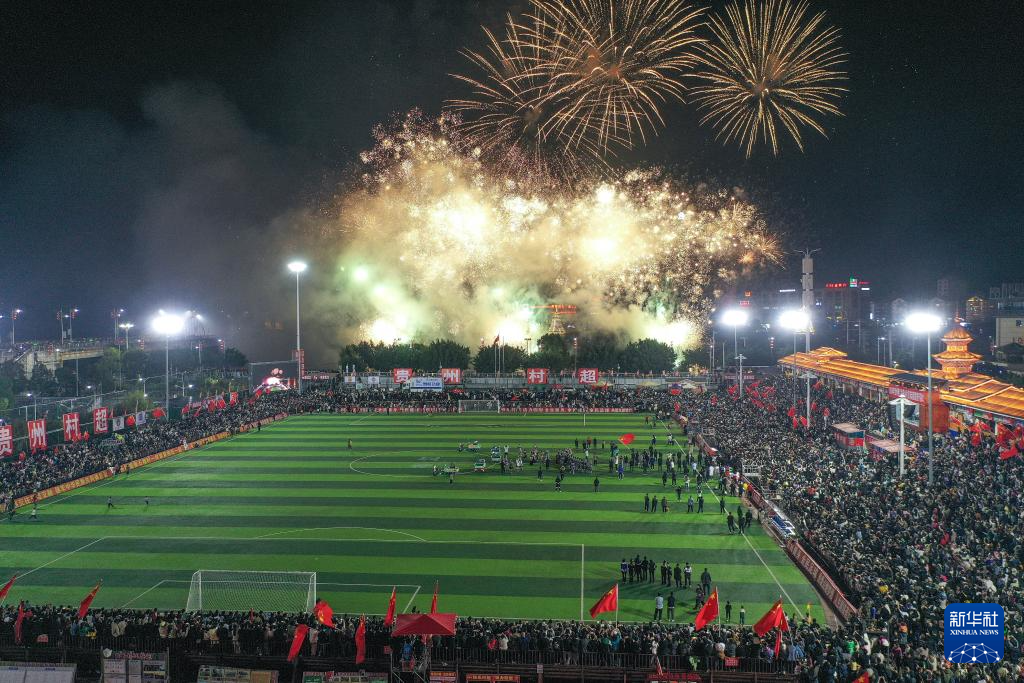 3月16日,“村超”现场上演音乐烟花秀(无人机照片)。新华社记者 杨文斌 摄