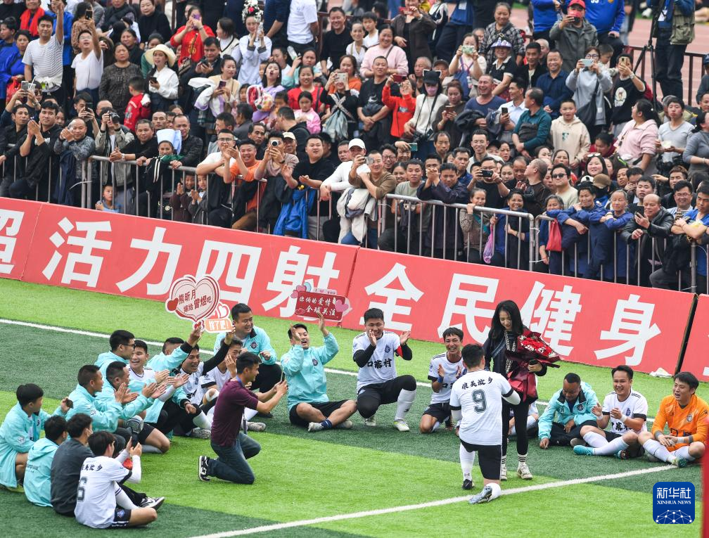 3月16日,口寨村足球队球员曾煜(9号)在中场休息时向女友求婚。新华社记者 杨文斌 摄