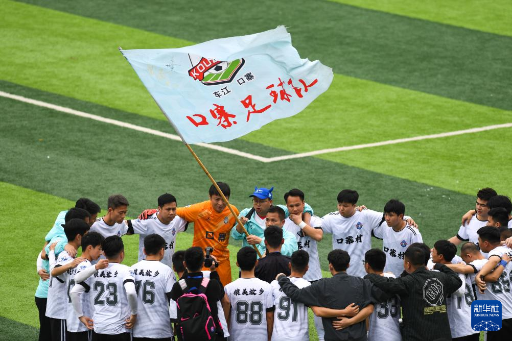 3月16日,口寨村足球队在赛前加油鼓劲。新华社记者 杨文斌 摄