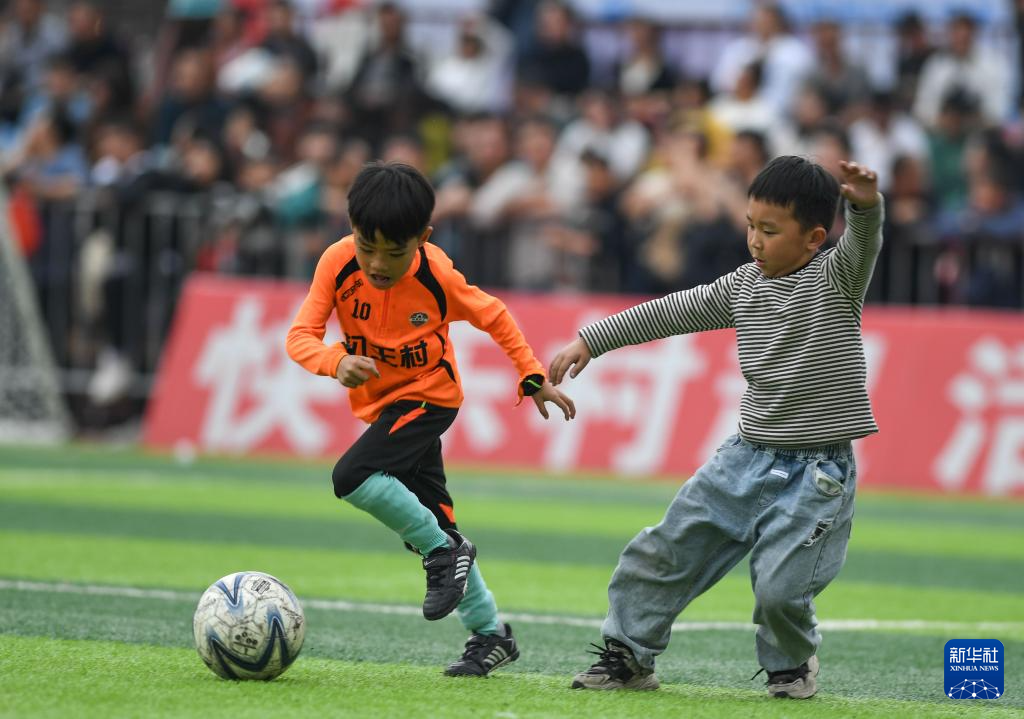 3月16日,两名小朋友在“村超”比赛间隙踢球。新华社记者 杨文斌 摄