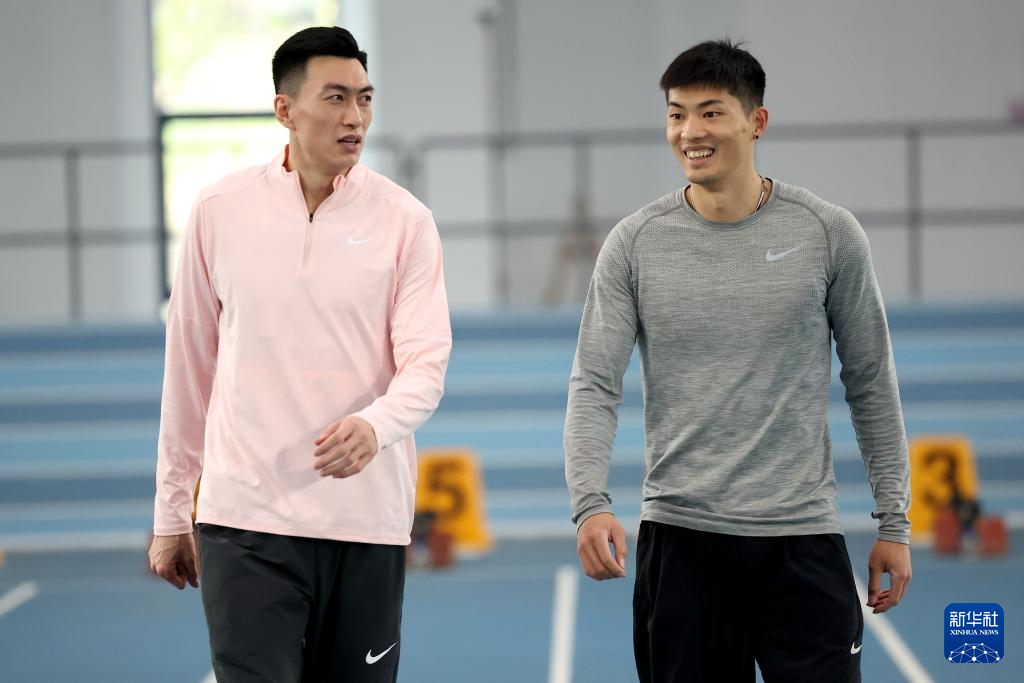 3月16日,广东队选手黄博凯(右)在比赛间隙与辽宁队三级跳远选手朱亚明交流。新华社记者 李明 摄