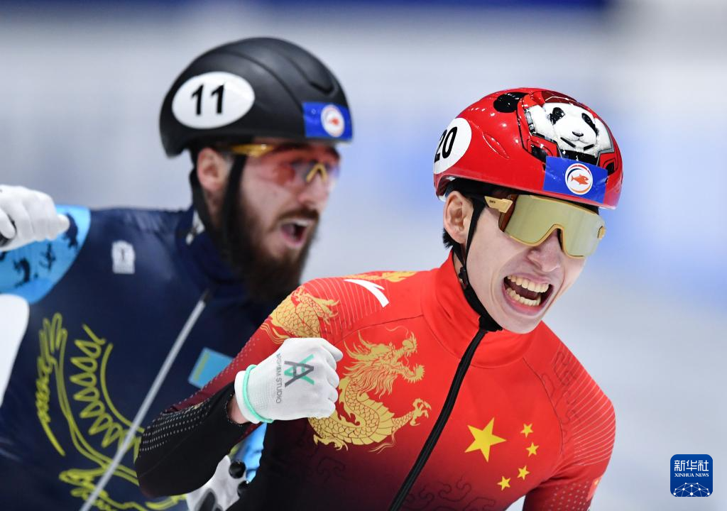 3月16日,林孝埈(前中)夺冠后与中国短道速滑队领队刘辰宇庆祝。新华社记者 连漪 摄