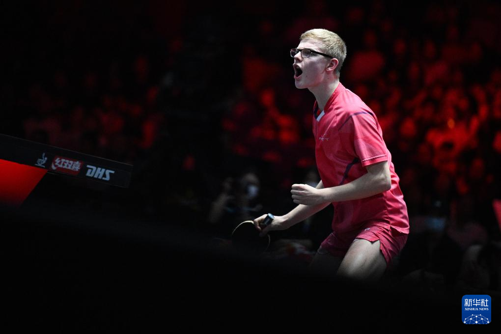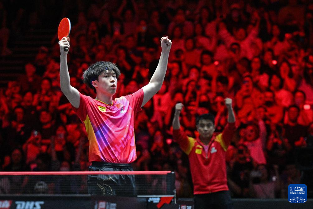 3月16日,中国选手王楚钦在赢得比赛后庆祝。新华社发(邓智炜摄)