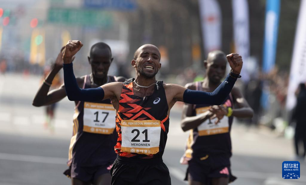 3月17日,埃塞俄比亚选手贾迈勒·伊梅尔·梅孔嫩庆祝夺得男子组冠军。新华社发(全休相摄)
