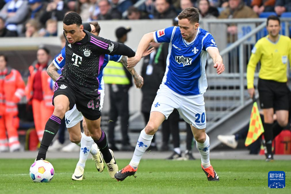 3月16日,拜仁慕尼黑队球员穆西亚拉(左)与达姆施塔特队球员肯佩拼抢。新华社发(乌尔里希·胡夫纳格尔 摄)