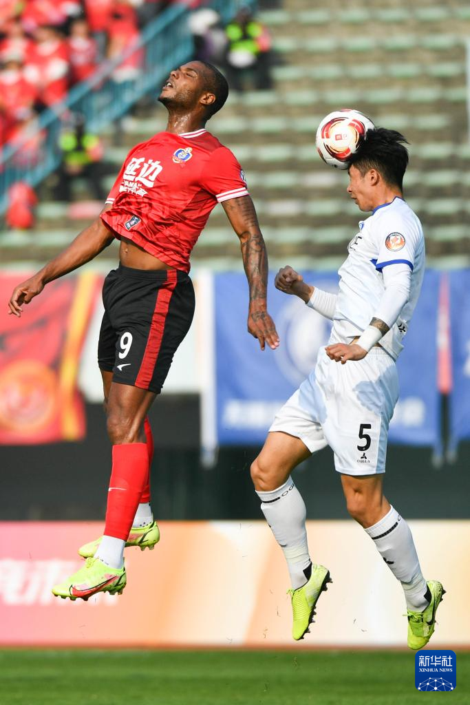 3月16日,无锡吴钩队球员林嘉豪(右)与延边龙鼎队球员罗南在比赛中争顶。新华社发(史康摄)