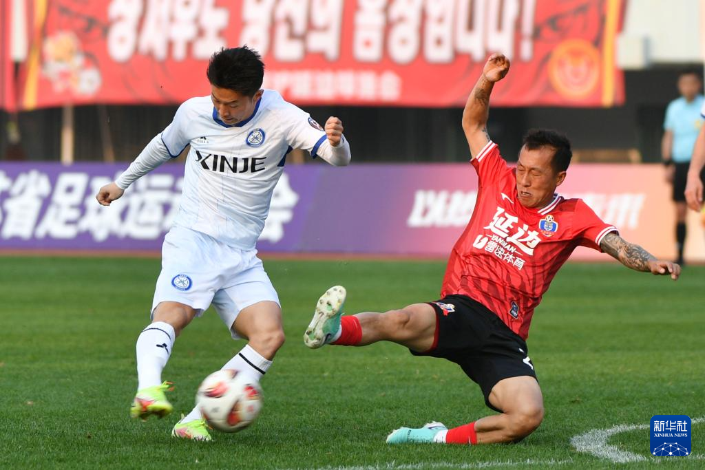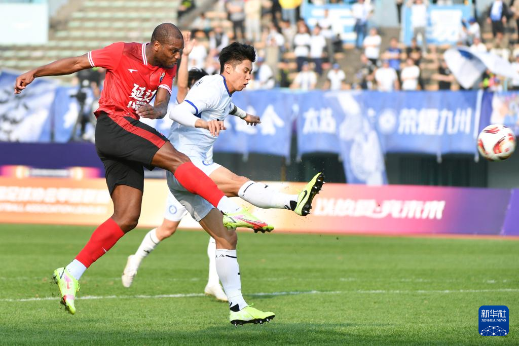 3月16日,延边龙鼎队球员罗南(左)在比赛中射门。新华社发(史康摄)