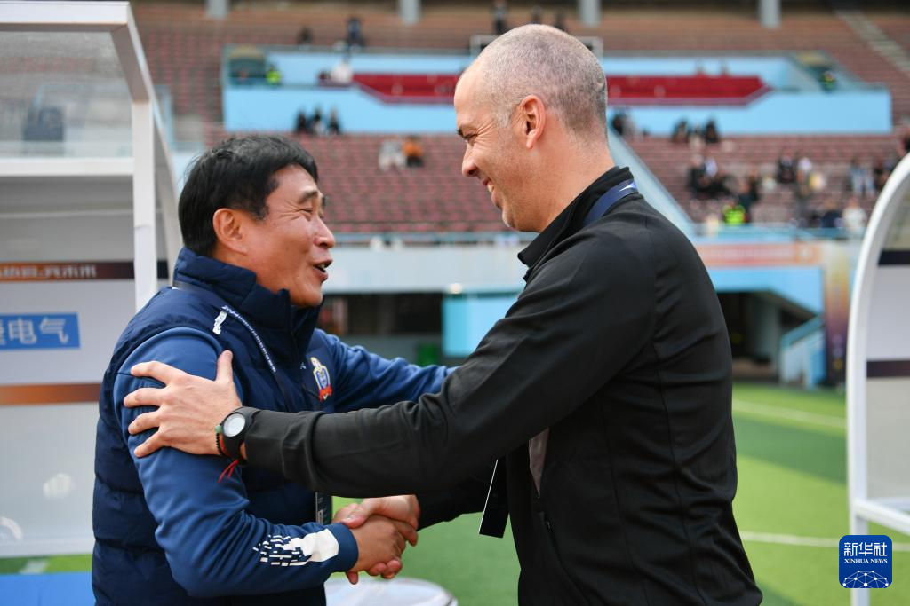 3月16日,无锡吴钩队主教练伊班·夸德拉多(右)和延边龙鼎队主教练金奉吉在比赛前握手。新华社发(史康摄)
