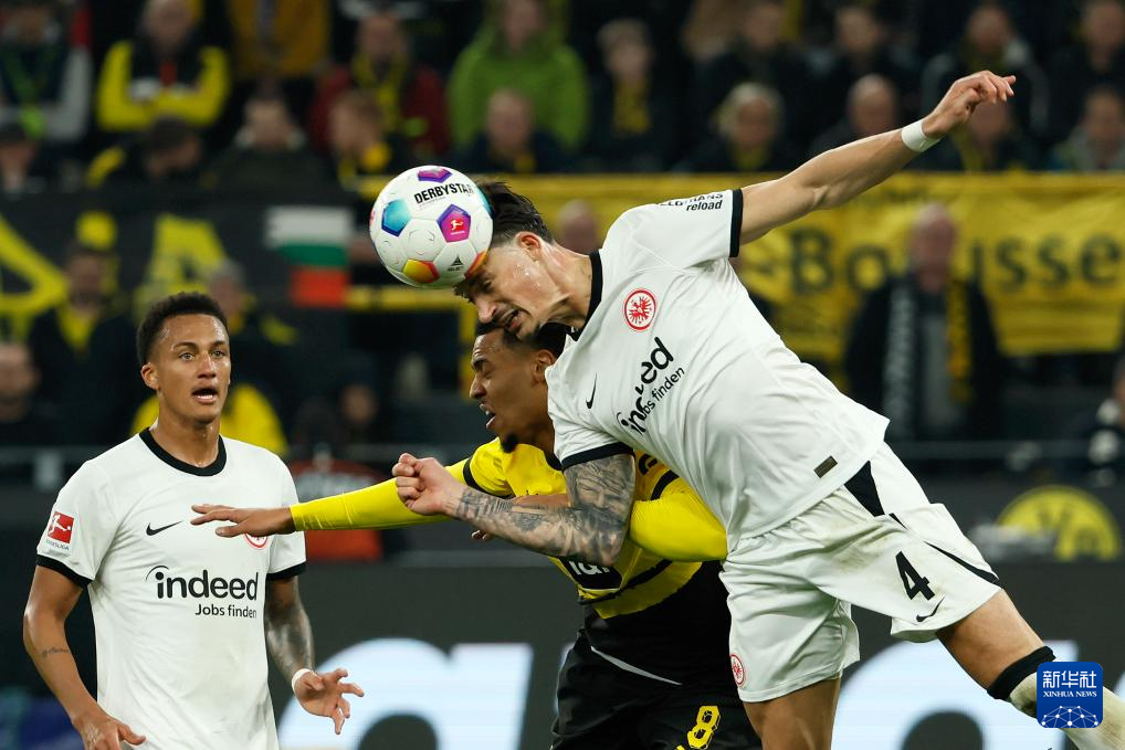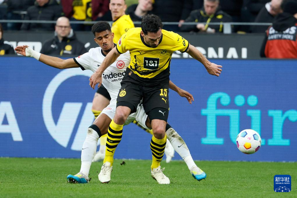3月17日,多特蒙德队球员胡梅尔斯(右)与法兰克福队球员克瑙夫在比赛中拼抢。新华社发(约阿希姆·毕瓦勒兹 摄)