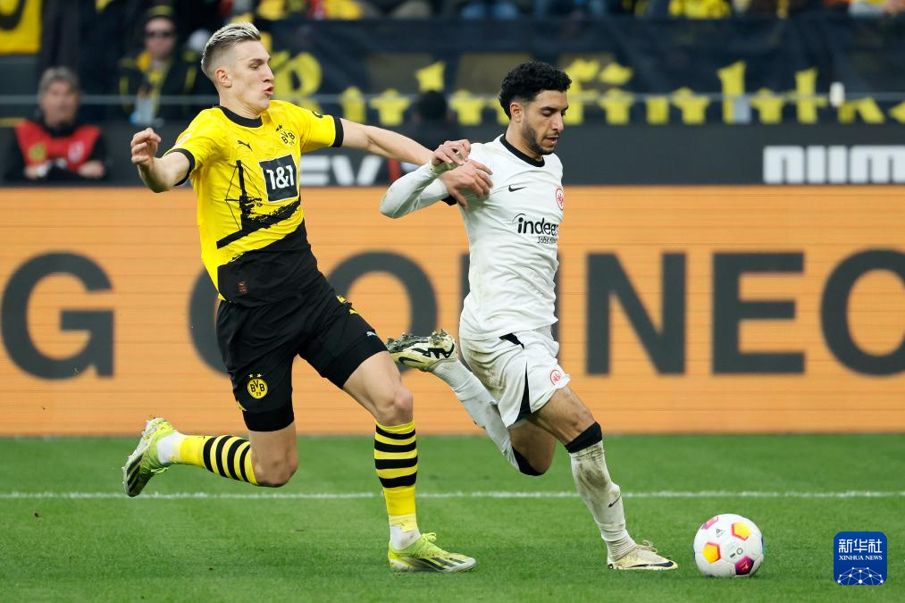 3月17日,多特蒙德队球员施洛特贝克(左)与法兰克福队球员马尔穆什在比赛中拼抢。新华社发(约阿希姆·毕瓦勒兹 摄)