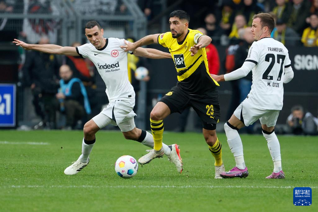 3月17日,多特蒙德队球员埃姆雷·詹(中)与法兰克福队球员斯希里(左)、格策在比赛中拼抢。新华社发(约阿希姆·毕瓦勒兹 摄)