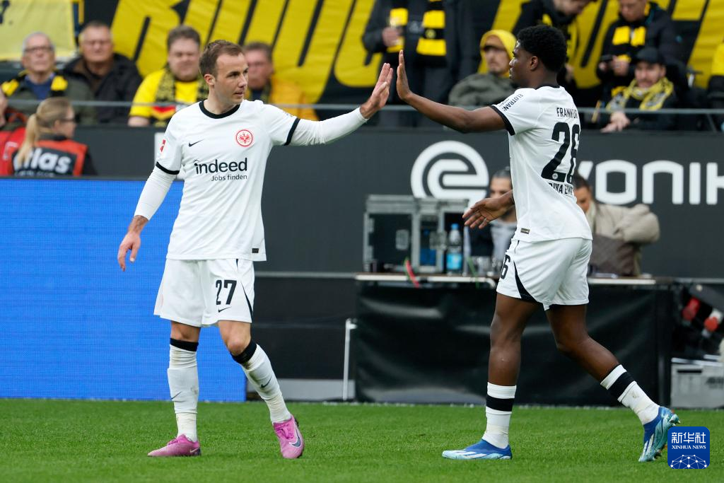 3月17日,法兰克福队球员格策(左)进球后与队友迪纳·埃宾姆贝击掌庆祝。新华社发(约阿希姆·毕瓦勒兹 摄)
