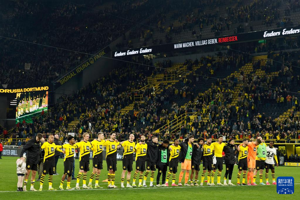 3月17日,多特蒙德队球员赛后向现场观众致意。新华社发(约阿希姆·毕瓦勒兹 摄)