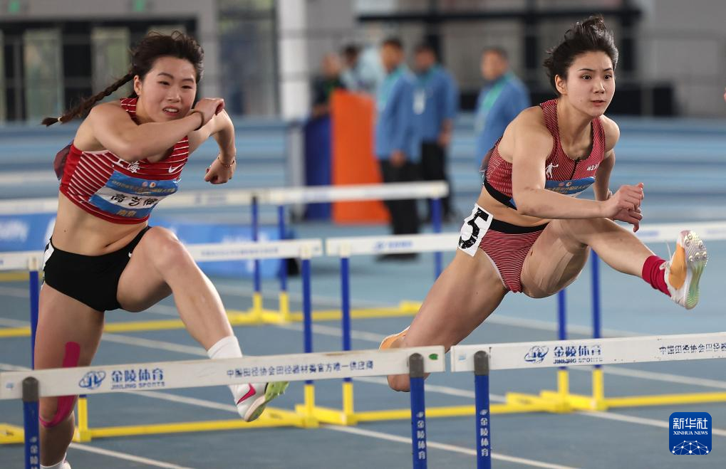 3月17日,湖南队选手夏思凝(右)在女子60米栏决赛中。最终她以8秒28的成绩夺得冠军。新华社记者 廖宇杰 摄