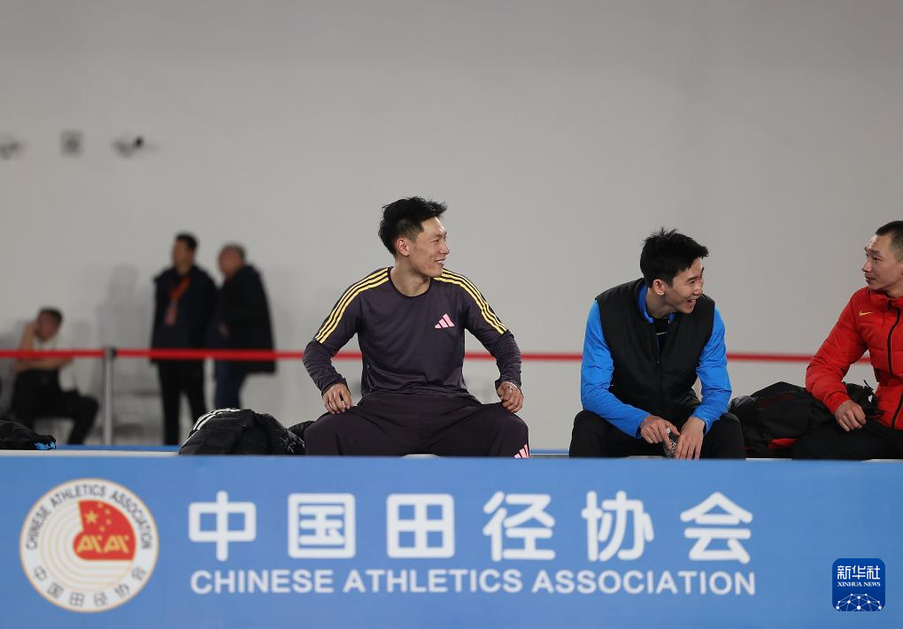 3月17日,江苏队选手石雨豪(左)在男子跳远决赛中与四川队选手黄常洲(中)、辽宁队选手张耀广交谈。最终石雨豪以8米04的成绩夺得冠军,黄常洲和张耀广分获亚军、季军。新华社记者 廖宇杰 摄