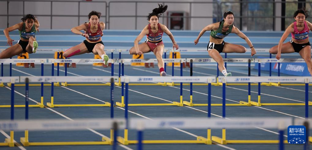 3月17日,湖南队选手夏思凝(中)在女子60米栏决赛中。最终她以8秒28的成绩夺得冠军。新华社记者 廖宇杰 摄