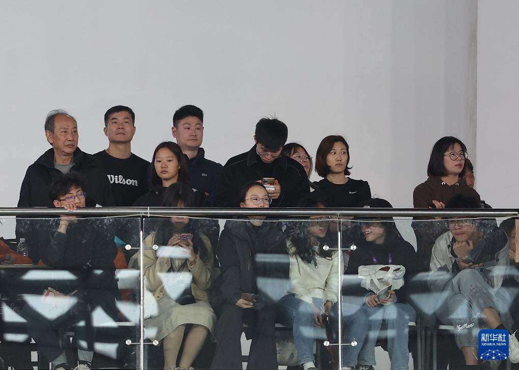 3月17日,教练员孙海平(后排左一)和前国家田径队男子跨栏运动员史冬鹏(后排左二)在看台关注男、女60米栏决赛。新华社记者 廖宇杰 摄