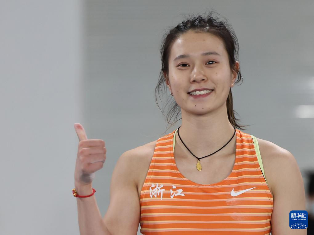 3月17日,浙江队选手陈巧铃在女子撑杆跳高决赛后庆祝。最终她以4米30的成绩夺得冠军。新华社记者 廖宇杰 摄