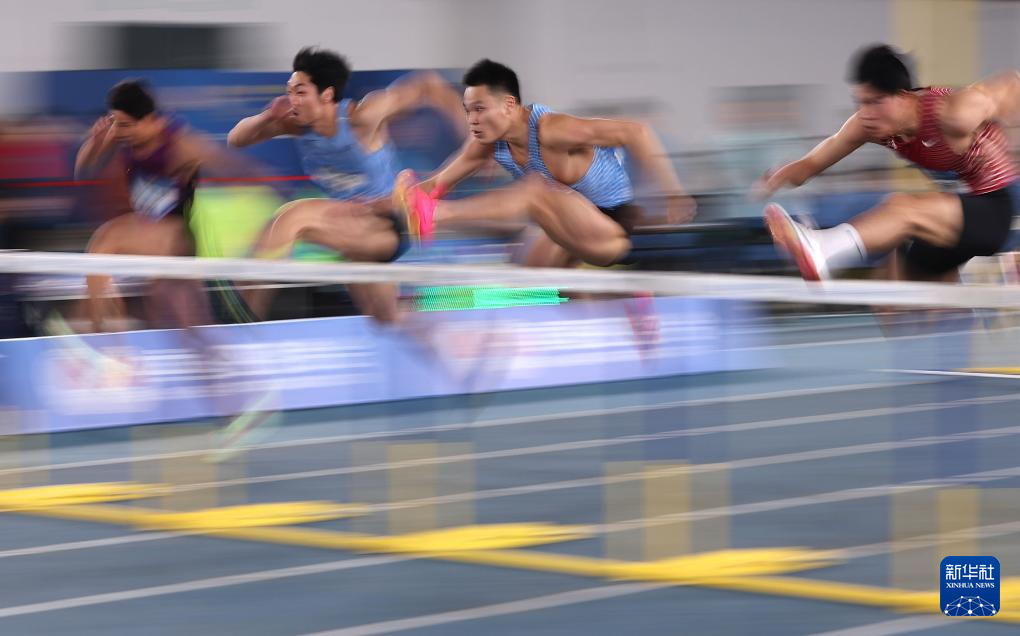 3月17日,湖北队选手朱胜龙(前左)在男子60米栏决赛中。最终他以7秒63的成绩夺得冠军。新华社记者 廖宇杰 摄