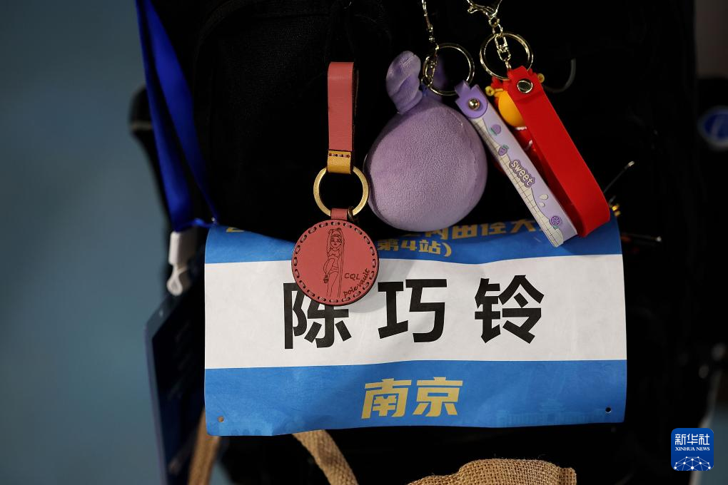 3月17日,浙江队选手陈巧铃的书包上挂着印有自己卡通形象的挂件。最终她以4米30的成绩夺得女子撑杆跳高冠军。新华社记者 廖宇杰 摄