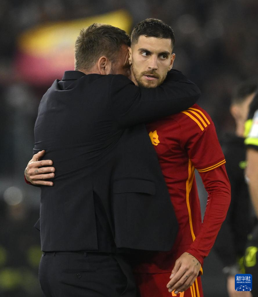 3月17日,罗马队球员佩莱格里尼(右)在进球后与主教练德罗西庆祝。新华社发(奥古斯托·卡萨索利摄)