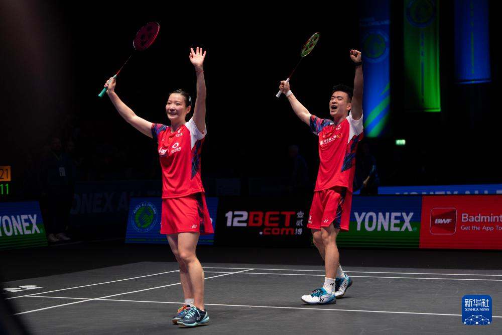 3月17日,郑思维(左)/黄雅琼在比赛后庆祝胜利。新华社发