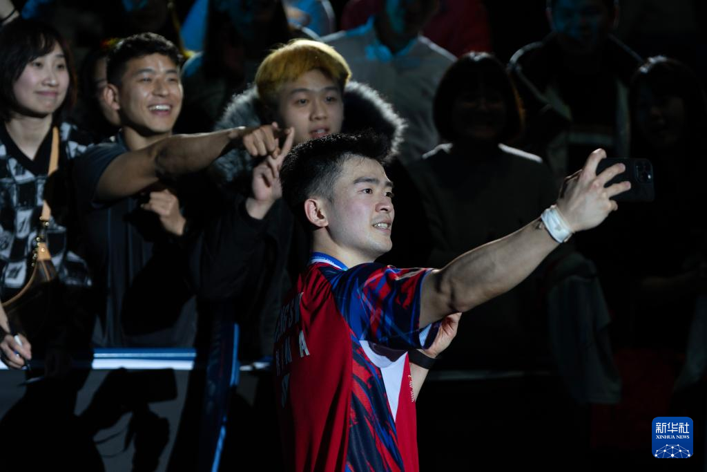 3月17日,郑思维(前)在比赛后与球迷合影留念。新华社发