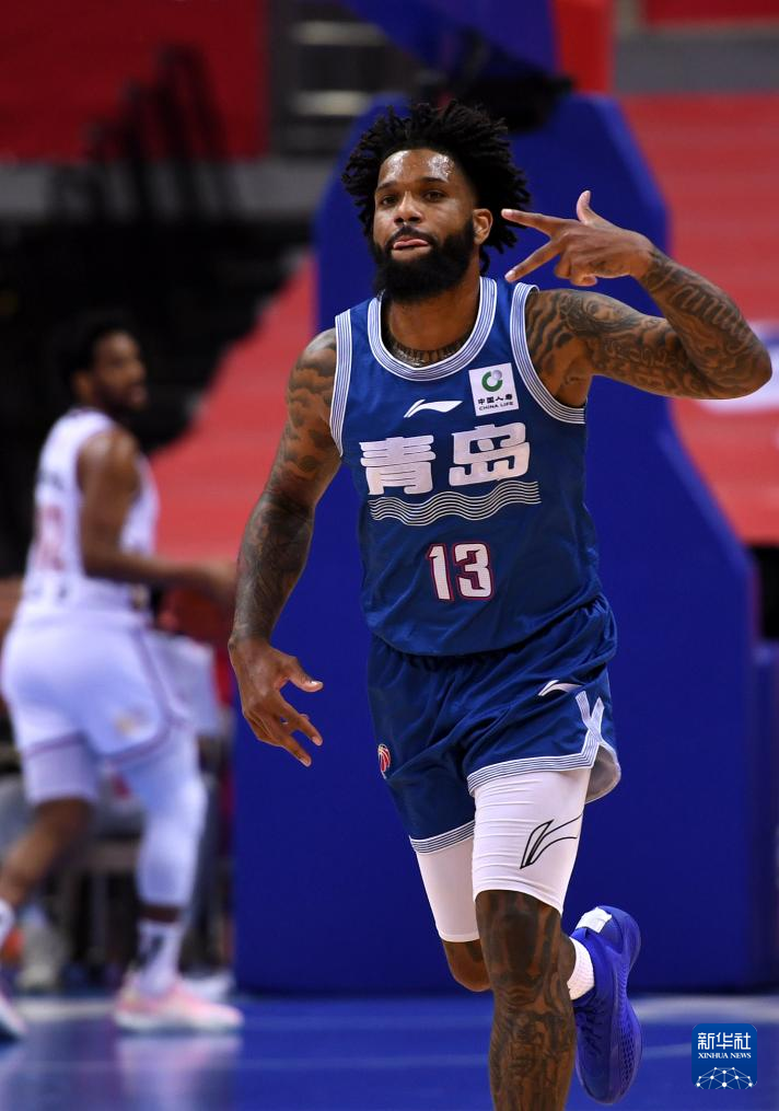 3月18日,青岛国信水产队球员鲍威尔在进球后庆祝。新华社记者 李紫恒 摄