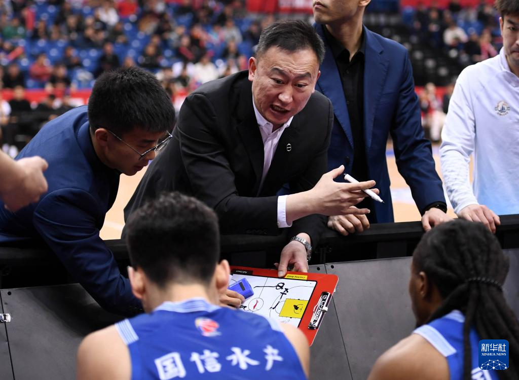 3月18日,青岛国信水产队主教练刘维伟(中)向队员布置战术。新华社记者 李紫恒 摄