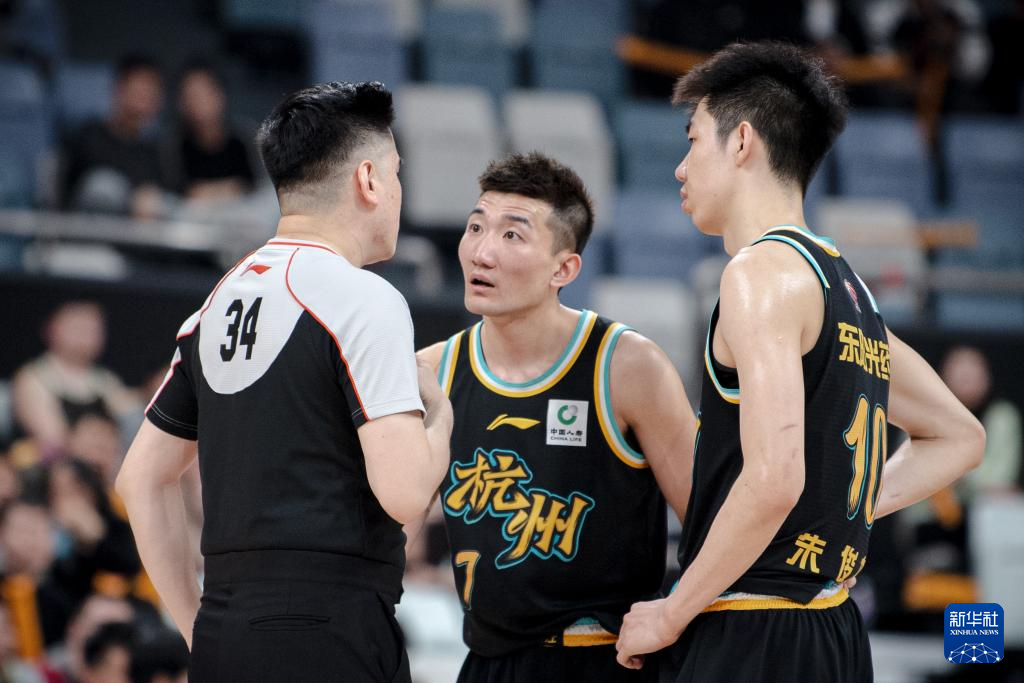 3月19日,浙江东阳光药队球员孙铭徽(中)被判罚技术犯规后与裁判交流。新华社记者 江汉 摄