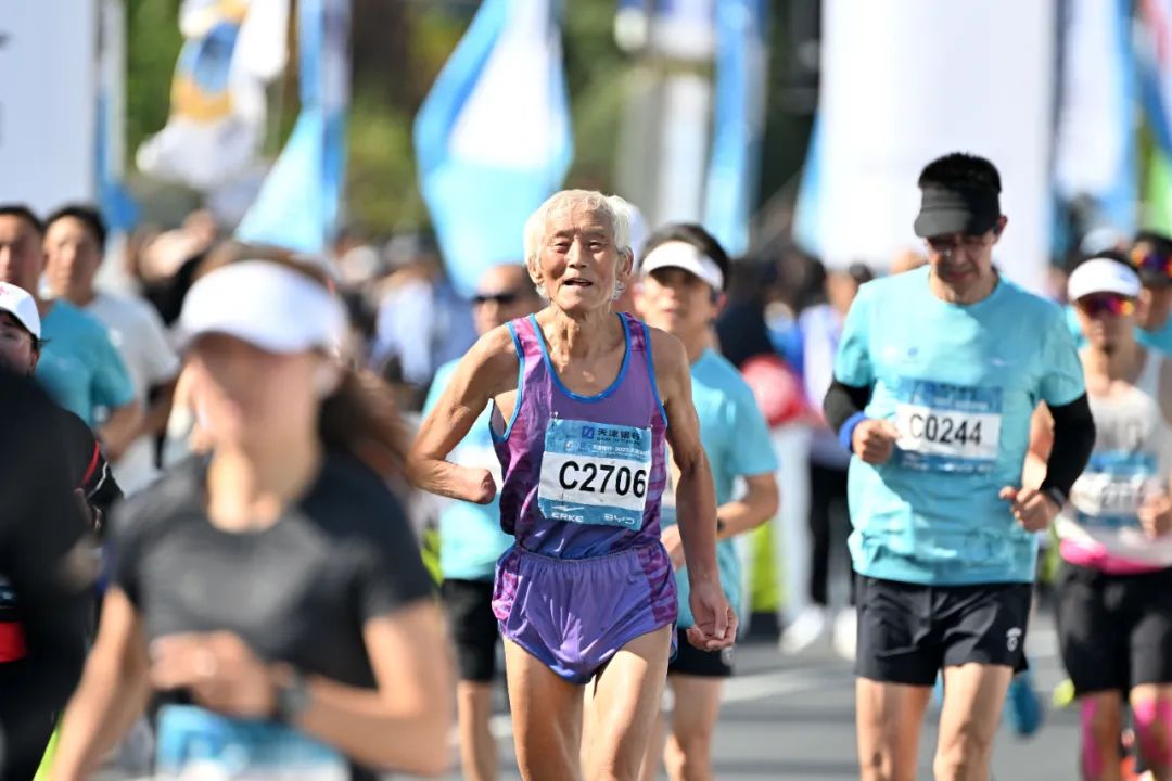 1981年,30岁的刘润龙参加了在天津举办的首届马拉松比赛。1996年,刘润龙在工作中因伤失去了右手,但肢体上的残缺并没有阻挡他热爱奔跑。截至目前,他的身影已遍及北京、大连、厦门等多个城市的马拉松赛场。图为2023年10月15日,刘润龙(中)在2023天津马拉松赛中奔跑。新华社记者 李然 摄