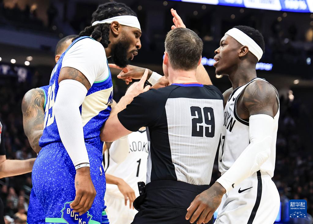 3月21日,雄鹿队球员克劳德(左)在比赛中与篮网队球员施罗德(右)争执。新华社发(乔尔·莱纳摄)