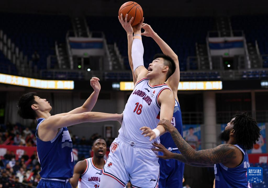 3月21日,广州龙狮队球员坎普(上)在比赛中上篮。新华社记者 李紫恒 摄