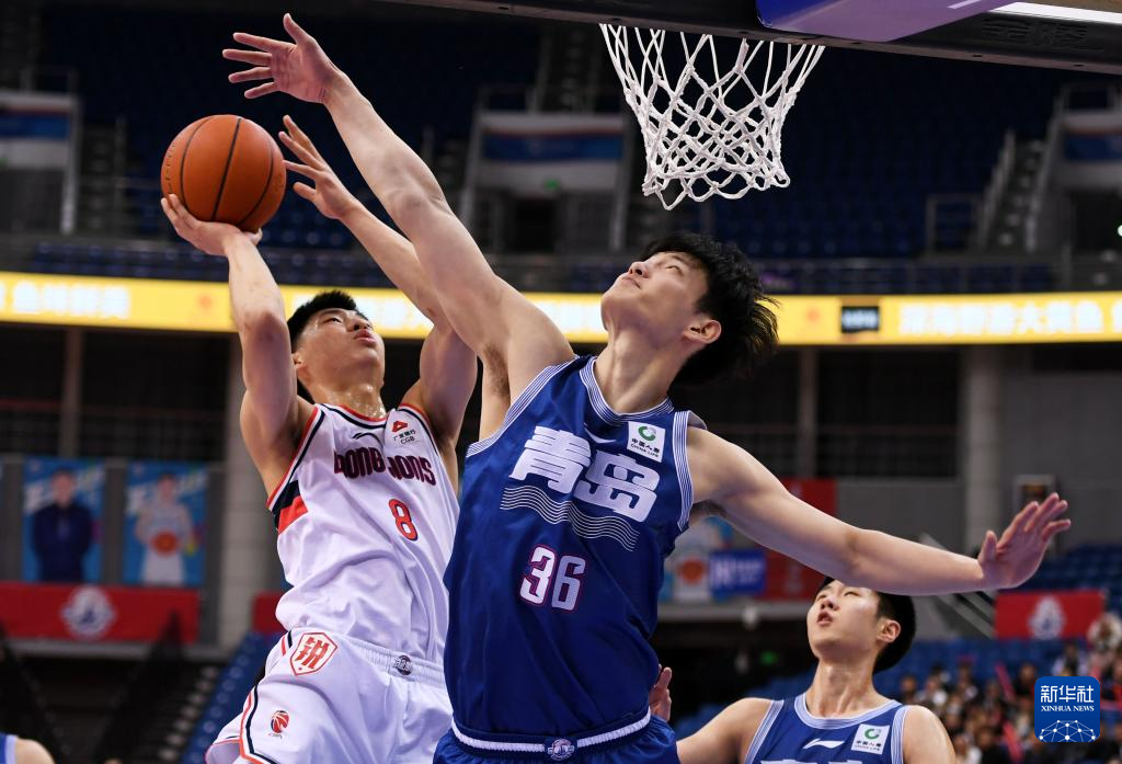 3月21日,广州龙狮队球员崔永熙(左)在青岛国信水产队球员纪卓的防守下上篮。新华社记者 李紫恒 摄