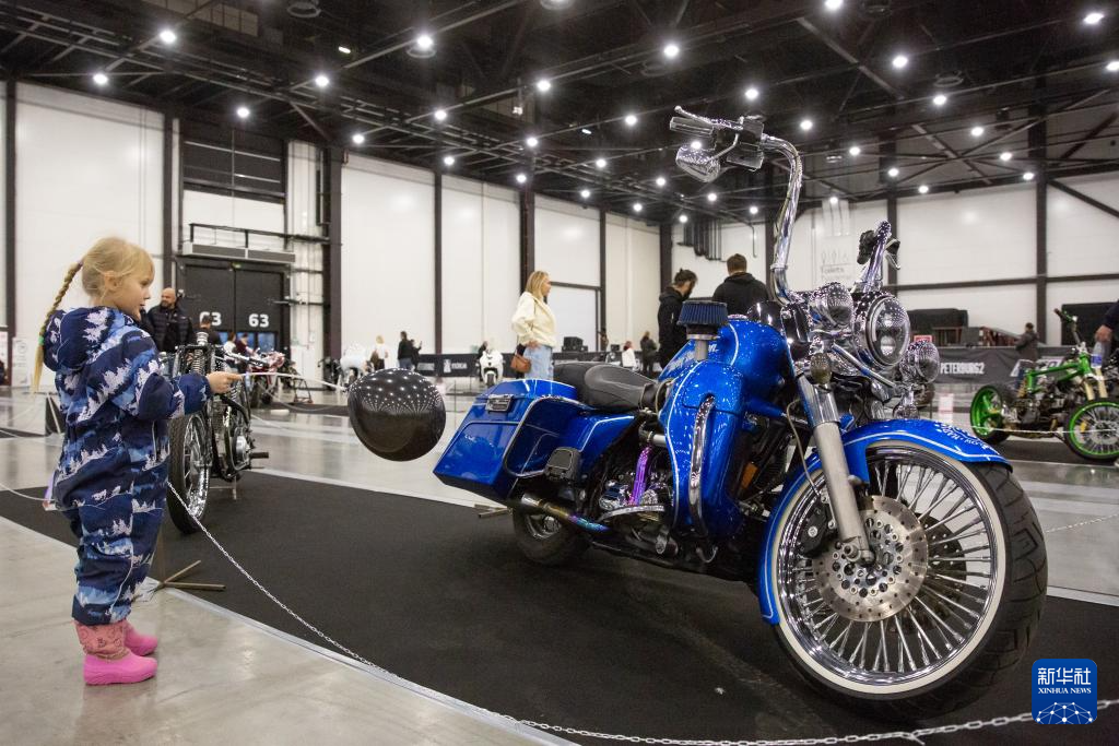 3月22日,一名儿童观看在“摩托车峰会-2024”上展出的摩托车。新华社发(莫京娜摄)