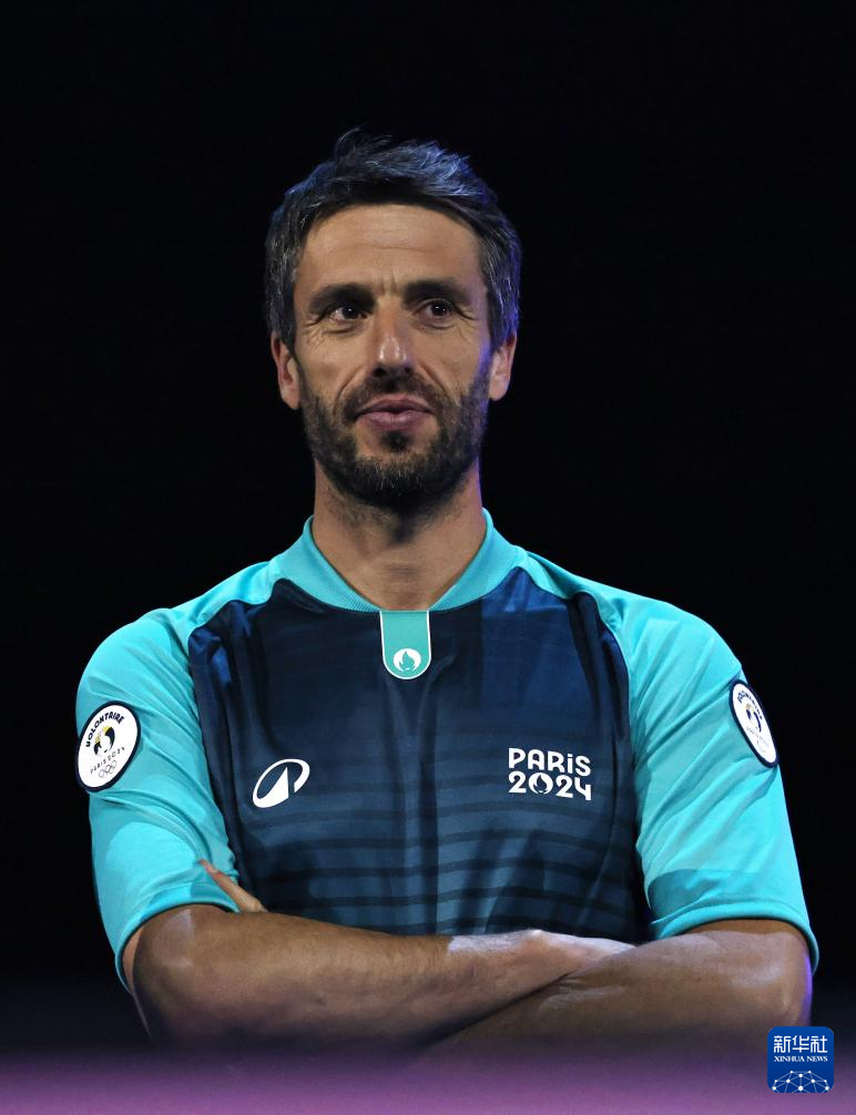 3月23日,巴黎奥组委主席托尼·埃斯坦盖身着志愿者制服出席巴黎奥运会志愿者大会。新华社记者 高静 摄