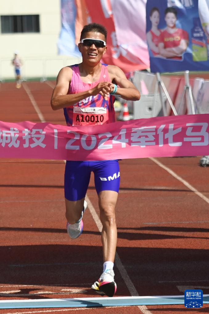 3月24日,王杰在比赛中冲线。他以2小时28分33秒的成绩获得全程马拉松赛冠军。新华社记者 黄宗治 摄