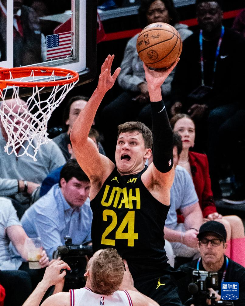 3月23日,爵士队球员沃克·凯斯勒(上)在比赛中上篮。新华社发(陈晨摄)
